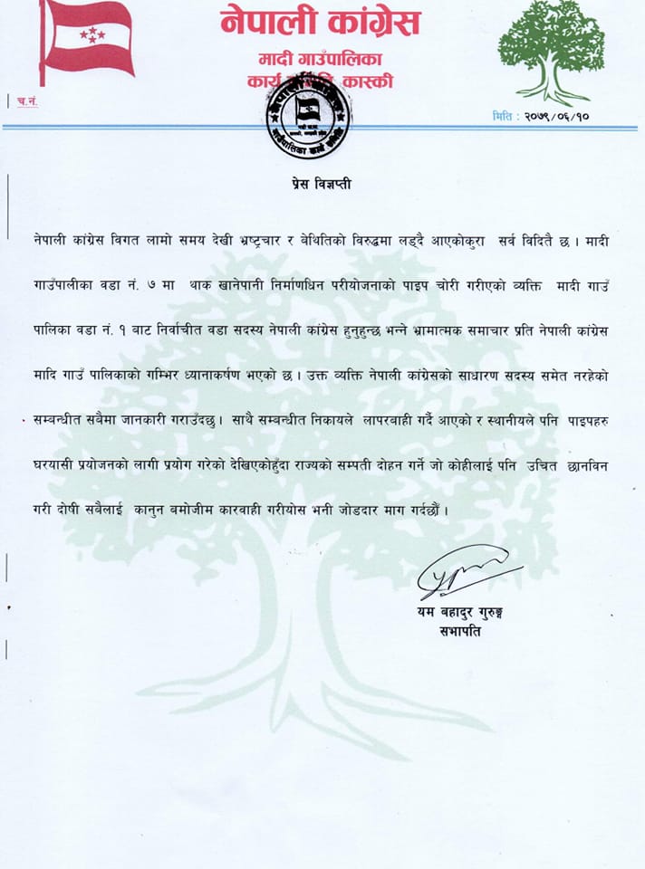 मादी गाउँपालिका वडानम्बर ७ मा थाक खानेपानीको पाईप चोरी गरीएको व्यक्ती मादी गाउँपालिका वडानम्बर १ को निर्वाचित वडासदस्य नेपाली कांडग्रेससंग आवद्ध नभएको पनि मादी कांग्रेसले विज्ञप्तीमा उल्लेख गरेको छ ।