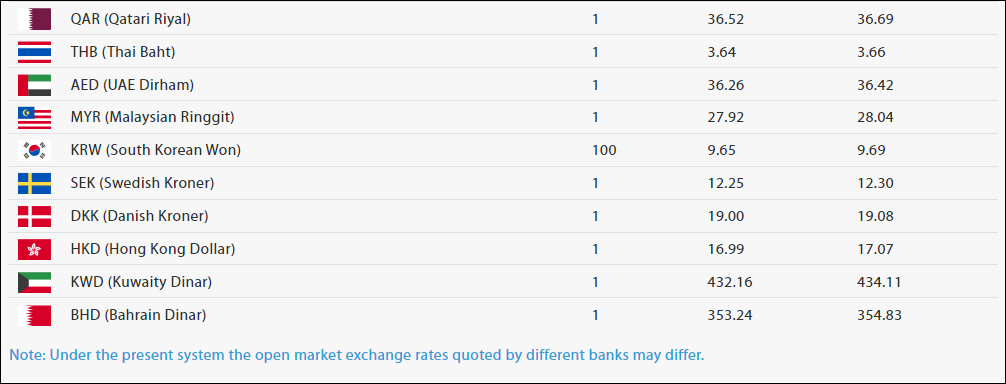 साउदी रियालको खरिददर ३५ रुपैयाँ ५० पैसा र बिक्रीदर ३५ रुपैयाँ ६६ पैसा छ ।कतारी रियालको मूल्य एकको खरिद दर ३६ रुपैयाँ ५२ पैसा र बिक्री दर ३६ रुपैयाँ ६९ पैसा रहेको राष्ट्र बैंकले जनाएको छ।