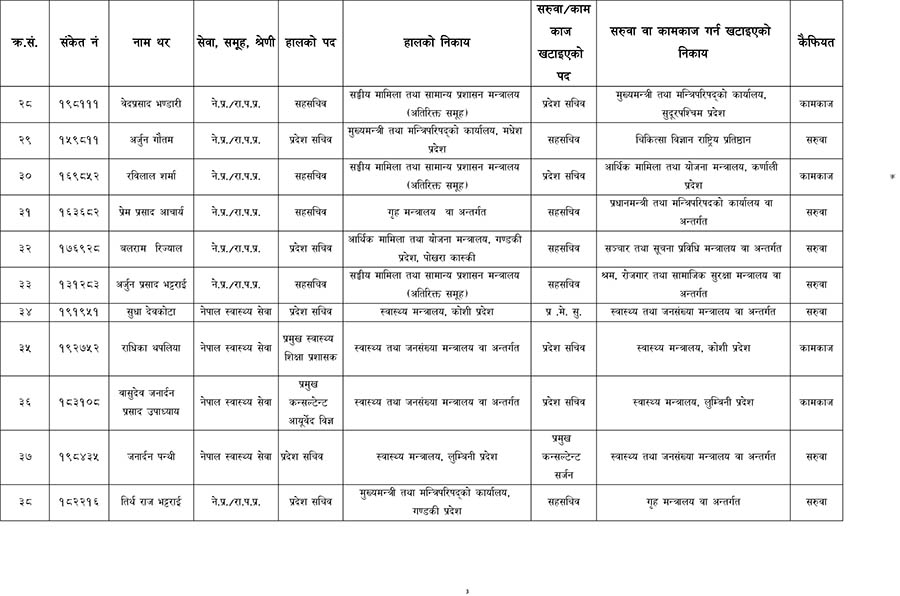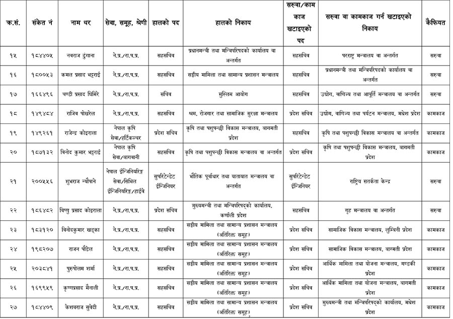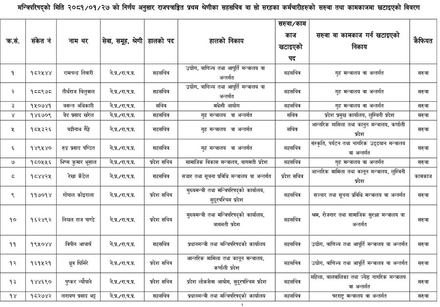 बाग्मतीको सामाजिक विकास मन्त्रालयका ससचिव रहेका भीष्मकुमानर भुसाललाई गृह मन्त्रालयमा सरुवा गरिएको छ ।मन्त्रिपरिषद कार्यालयका सहसचिव नारायणप्रसाद भट्ट र नवराज ढुंगानालाई परराष्ट्र मन्त्रालयमा सरुवा गरिएको छ ।