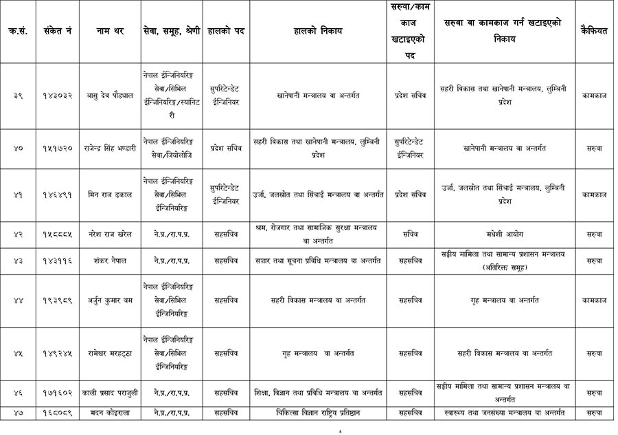 सरकारको निर्णयअनुसार मधेशी आयोगका सचिव रहेका बसन्त अधिकारीलाई गृह मन्त्रालयमा पठाइएको छ । रुद्रप्रसाद पण्डितलाई गृहबाट संस्कृति पर्यटन तथा नागरिक उड्डयन मन्त्रालयमा लगिएको छ ।