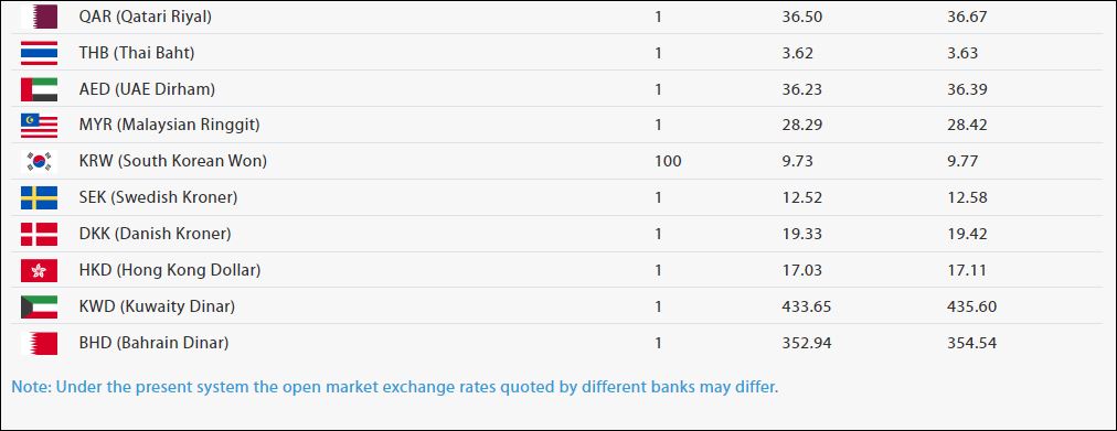साउदी रियालको खरिददर ३५ रुपैयाँ ४८ पैसा र बिक्रीदर ३५ रुपैयाँ ६४ पैसा छ ।कतारी रियालको मूल्य एकको खरिद दर ३६ रुपैयाँ ५० पैसा र बिक्री दर ३६ रुपैयाँ ६७ पैसा रहेको राष्ट्र बैंकले जनाएको छ।