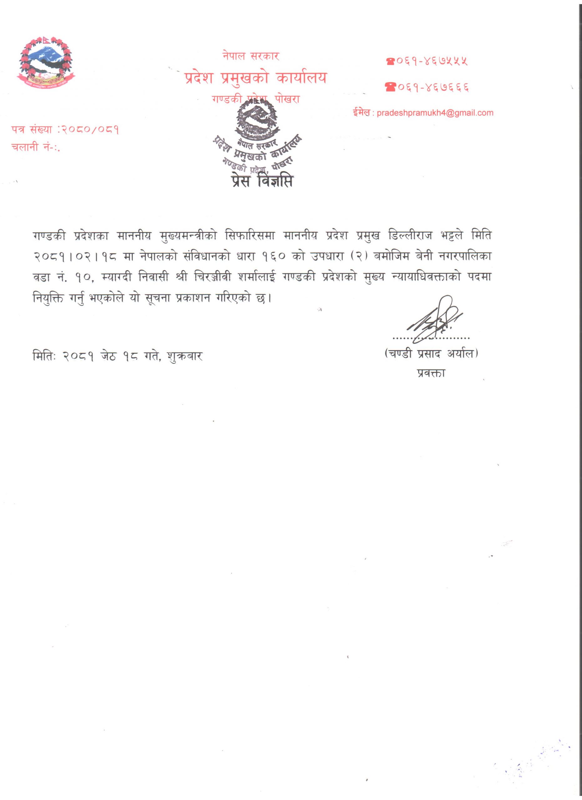 प्रदेश प्रमुख डिल्लीराज भट्टले आज (२०८१ जेठ १८ गते नेपालको संविधानको धारा १६० को उपधारा २ बमोजिम बेनी नगरपालिका वडा नंं. १० म्याग्दीका शर्मालाई उक्त पदमा नियुक्त गरेका हुन् ।