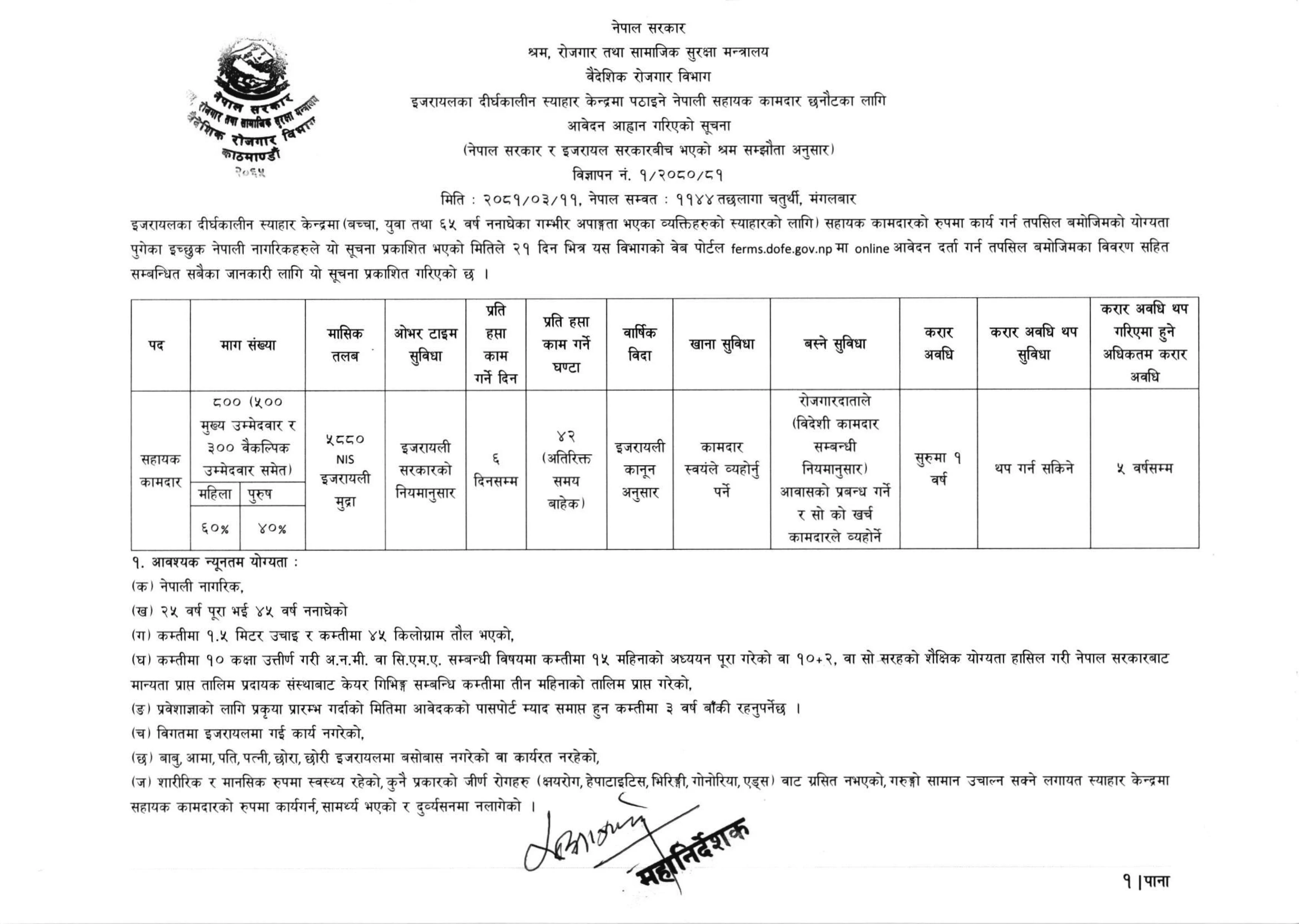 ८०० जना माग गरिएकोमा ५०० जना मुख्य उम्मेदवार हुनेछन् भने ३०० जना वैकल्पिक उम्मेदवार हुनेछन् । जसमा ६० प्रतिशत महिला र ४० प्रतिशत पुरुष हुनेछन् । उनीहरुले मासिक पाँच हजार ८८० सेकेल (इजरायली मुद्रा)न्यूनतम तलब हुनेछ । जुन नेपालका दुई लाख १० हजार नेपाली रुपैयाँभन्दा बढी हुनेछ । इजरायल जाने कामदारको करार अवधी पाँच वर्षको हुनेछ ।