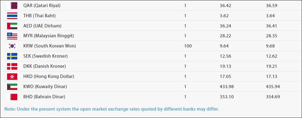 साउदी रियालको खरिददर ३५ रुपैयाँ ४८ पैसा र बिक्रीदर ३५ रुपैयाँ ६४ पैसा छ ।कतारी रियालको मूल्य एकको खरिद दर ३६ रुपैयाँ ४२ पैसा र बिक्री दर ३६ रुपैयाँ ५९ पैसा रहेको राष्ट्र बैंकले जनाएको छ।