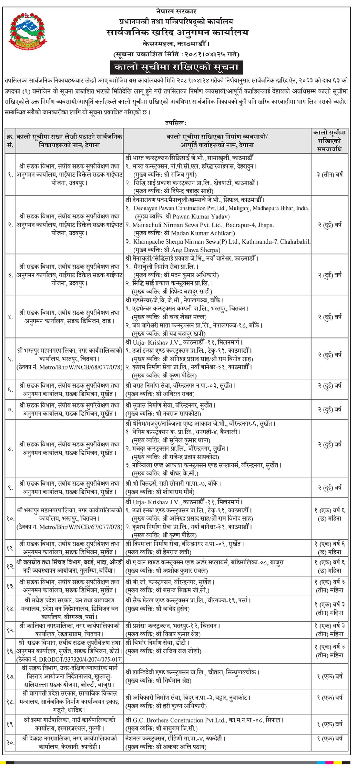 सार्वजनिक खरिद अनुगमन कार्यालयले दुई दर्जन ठेकेदार कम्पनीहरुलाई कालोसूचीमा राखेको छ ।