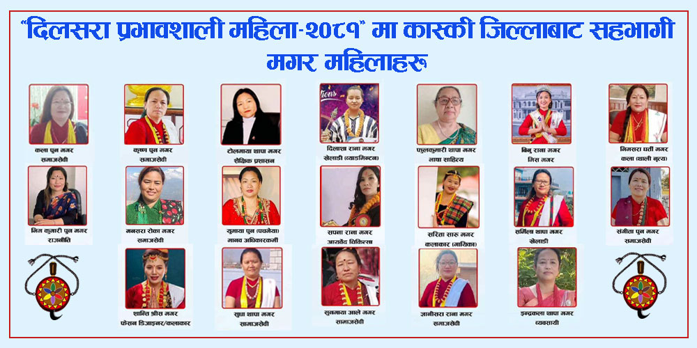 उनका अनुसार ‘प्रभावशाली मगर महिला–२०८१’ मा सहभागिता जनाउन चाहने महिलाले आफूले गरेको विभिन्न कामको विवरण सहित इच्छुकले गुगल तथा इमेल मार्फत् फारम भर्न सकिने बताउँदै कस्कीबाट १९ जना प्रभावशाली मगर महिलाहरु सहभागी भएको कथा लेखक थापामगरले बताइन् ।