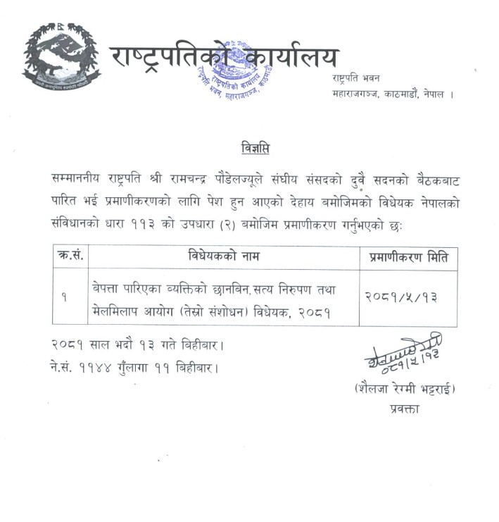 राष्ट्रपति रामचन्द्र पौडेलले सत्य निरुपण तथा मेलमिलाप आयोग र बेपत्ता नागरिक छानबिन आयोगसम्बन्धी (टीआरसी) विधेयक प्रमाणीकरण गरेका छन ।राष्ट्रपति पौडेलले बिहीबार नेपालको संविधानको धारा ११३ को उपधारा (२) बमोजिम उक्त विधेयक प्रमाणीकरण गरेका हुन् ।