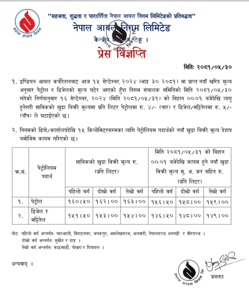 निगमले निकालेको विज्ञप्तिअनुसार पेट्रोलमा प्रतिलिटर ४ र डिजेल/मट्टितेलमा ५/५ रुपैयाँले मूल्य घटेको छ ।
