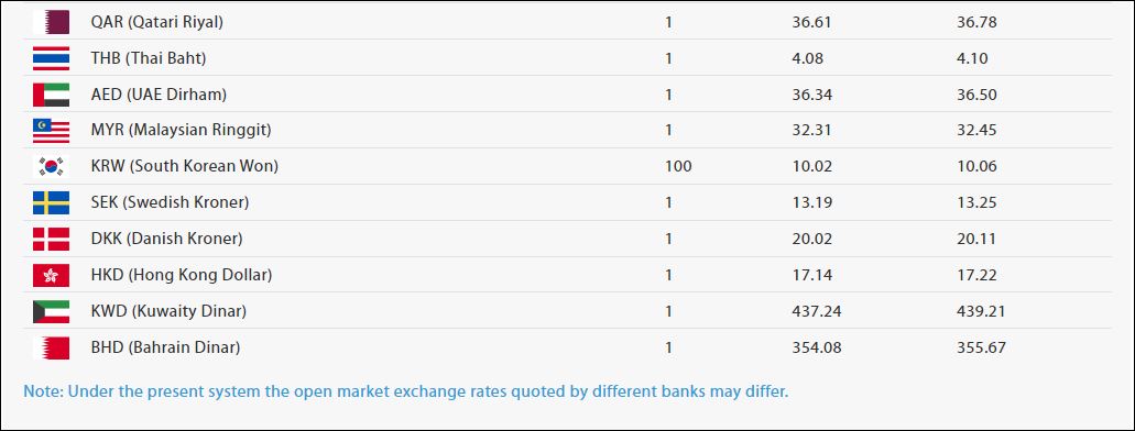 साउदी रियालको खरिददर ३५ रुपैयाँ ५७ पैसा र बिक्रीदर ३५ रुपैयाँ ७३ पैसा छ ।कतारी रियालको मूल्य एकको खरिद दर ३६ रुपैयाँ ६१ पैसा र बिक्री दर ३६ रुपैयाँ ७८ पैसा रहेको राष्ट्र बैंकले जनाएको छ।