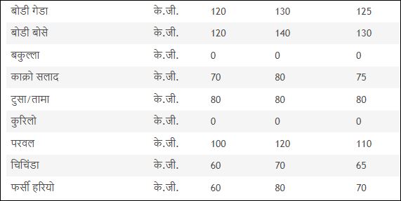 आज कृषि तथा पशु विकास महाशाखा गण्डकी प्रदेश पोखराले सार्वजनिक गरेको तरकारीको मूल्य अनुसार तरकारीको भाउ ह्वात्तै बढेको छ ।