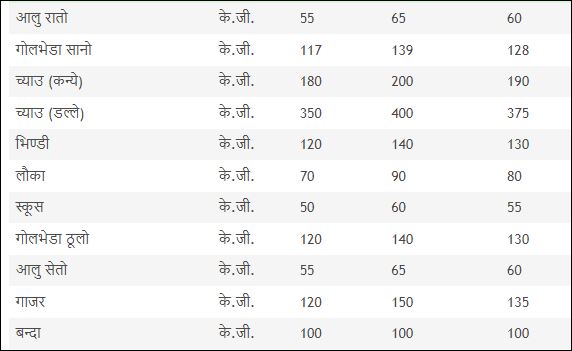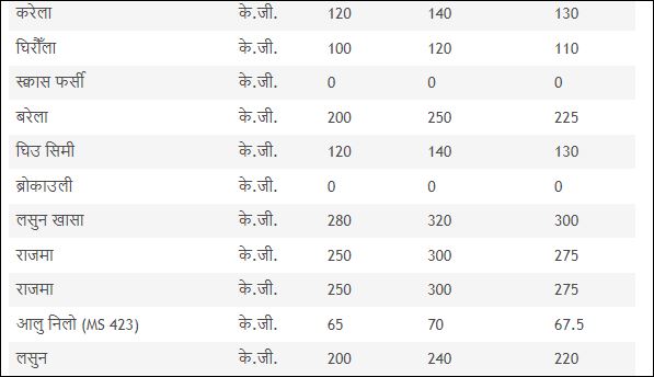 आज कृषि तथा पशु विकास महाशाखा गण्डकी प्रदेश पोखराले सार्वजनिक गरेको तरकारीको मूल्य अनुसार तरकारीको भाउ ह्वात्तै बढेको छ ।
