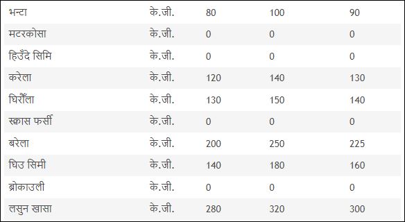 यस्तै घिरौला १४० रुपैयाँ के।जी छ । यस्तै आज प्याज सुकेको १२० रुपैयाँ , गाजर १३५ रुपैयाँ प्रति केजी रहेको छ । रायोको साग ८० रुपैयाँ रहेको छ ।