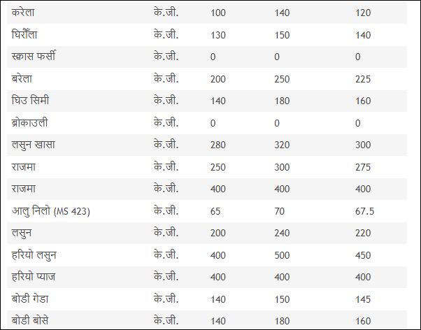 पोखरामा आज रातो र सेतो दुवै आलुको भाउ प्रति के।जी ६० रुपैयाँ रहेका छ ।यस्तै घिरौला १४० रुपैयाँ के.जी छ । यस्तै आज प्याज सुकेको १२० रुपैयाँ , गाजर १३५ रुपैयाँ प्रति केजी रहेको छ । रायोको साग ८० रुपैयाँ रहेको छ ।