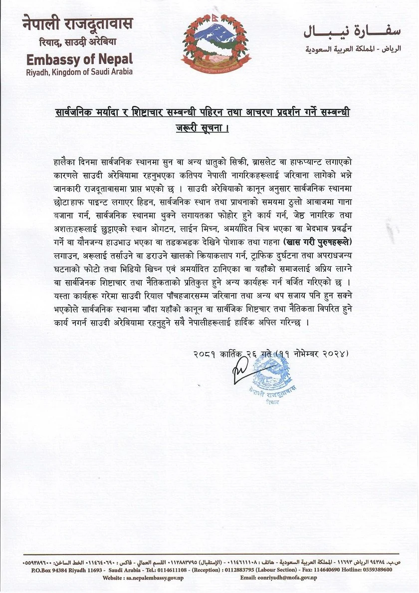 साउदी अरेबियास्थित नेपाली राजदूतावासले सार्वजनिक स्थानमा छोटा हाफ पाइन्ट लगाएर नहिँड्न नेपालीहरूलाई अनुरोध गरेको छ । केही दिनमा सार्वजनिक स्थानमा सुन वा अन्य धातुको सिक्री, ब्रासलेट तथा हाफ पाइन्ट लगाएको कारण कतिपय नेपालीहरू जरिवानामा परेको जनाउँदै दूतावासले त्यस्तो नगर्न भनेको हो ।