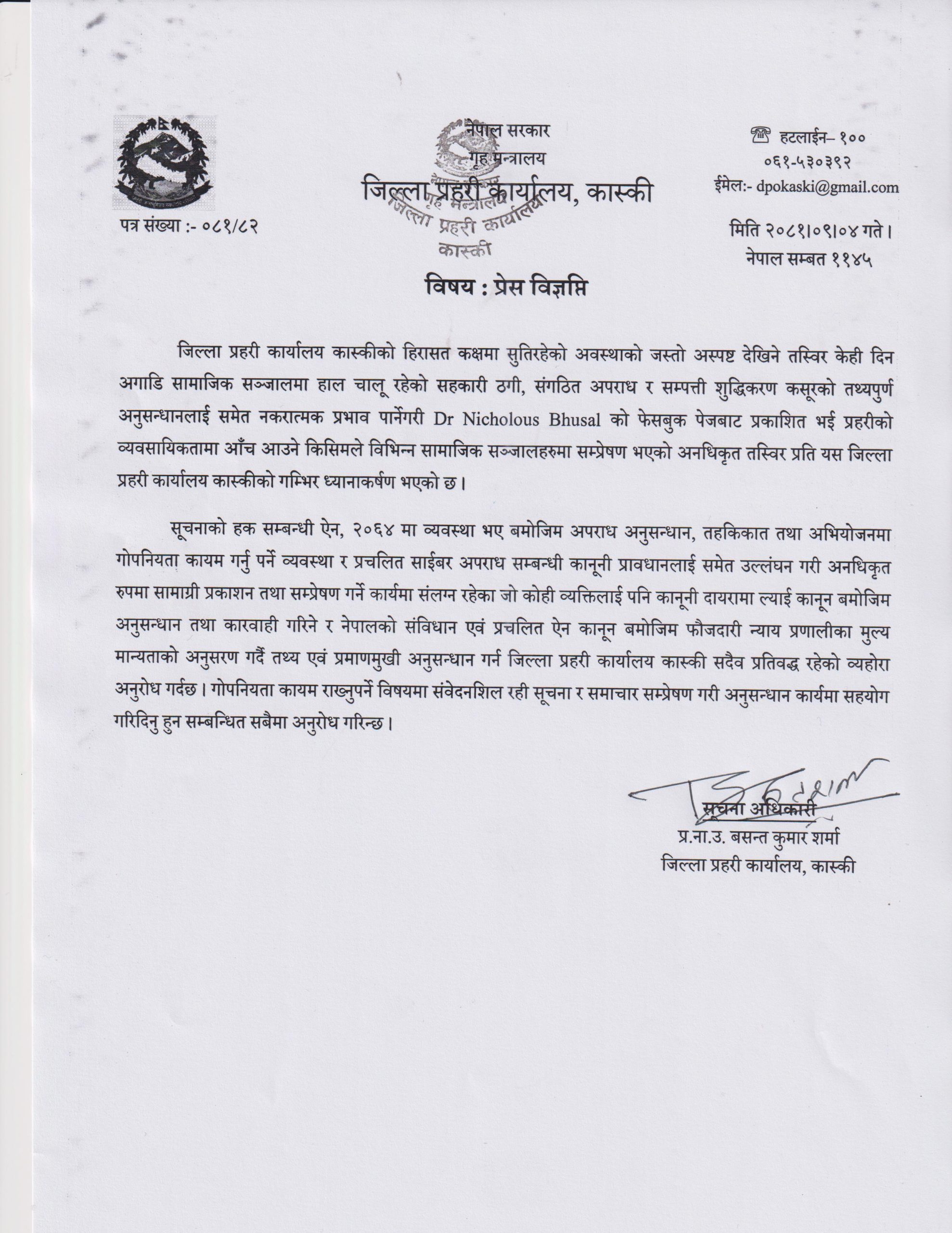 ‘सूचनाको हक सम्बन्धी ऐन, २०६४ मा व्यवस्था भए बमोजिम अपराध अनुसन्धान, तहकिकात तथा अभियोजनमा गोपनियता कायम गर्नुपर्ने व्यवस्था र प्रचलित साइबर अपराध सम्बन्धी कानुनी प्रावधानलाई समेत उल्लंघन गरी अनधिकृत रूपमा सामग्री प्रकाशन तथा सम्प्रेषण गर्ने कार्यमा संलग्न रहेका जो कोही व्यक्तिलाई पनि कानुनी दायरामा ल्याई कानुन बमोजिम अनुसन्धान तथा कारबाही गरिने,’ प्रहरी नायव उपरीक्षक एवं प्रवक्ता बसन्तकुमार शर्माले विज्ञप्तिमा उल्लेख गरेका छन् ।