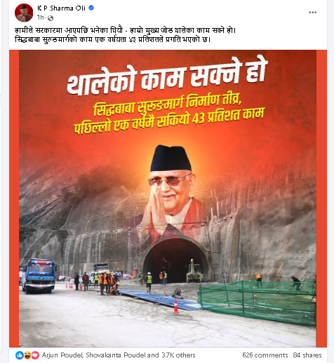 प्रधानमन्त्री ओलीले लेखेका छन्, ‘हामीले सरकारमा आएपछि भनेका थियौं– हाम्रो मुख्य जोड थालेका काम सक्ने हो । सिद्धबाबा सुरुङमार्गको काम एक वर्षयता ४३ प्रतिशतले प्रगति भएको छ।’