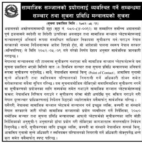 सञ्चार तथा सूचना प्रविधि मन्त्रालयले सूचना प्रकाशित गर्दै हालसम्म सूचीकरण नभएका स्वदेशी वा विदेशी सामाजिक सञ्जाल प्लेटफर्मलाई तोकिएको समयसीमाभित्र मन्त्रालयमा सम्पर्क गरी सूचीकरण गर्न आग्रह गरेको छ ।