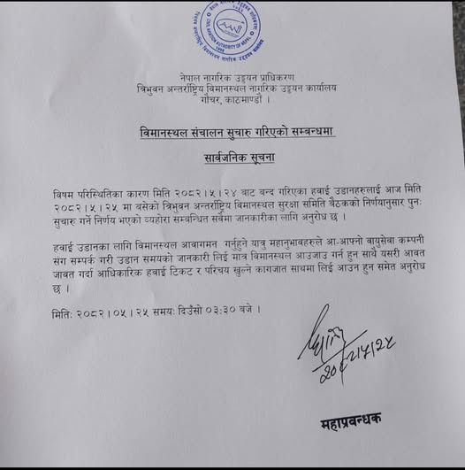 त्रिभुवन अन्तर्राष्ट्रिय विमानस्थल सुचारु भएको छ ।विमानस्थल सुरक्षा समितिको बैठकले विमानस्थल सुचारु गर्ने निर्णय गरेको हो ।