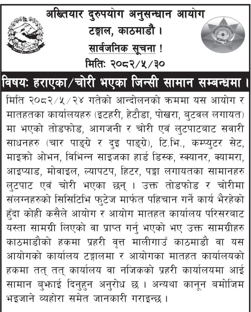 अख्तियार दुरुपयोग अनुसन्धान आयोगले भदौ २४ गतेको आन्दोलनका क्रममा आफ्ना कार्यालयहरूबाट चोरी भएका सामग्रीहरू फिर्ता गर्न एक सार्वजनिक सूचना जारी गरेको छ।