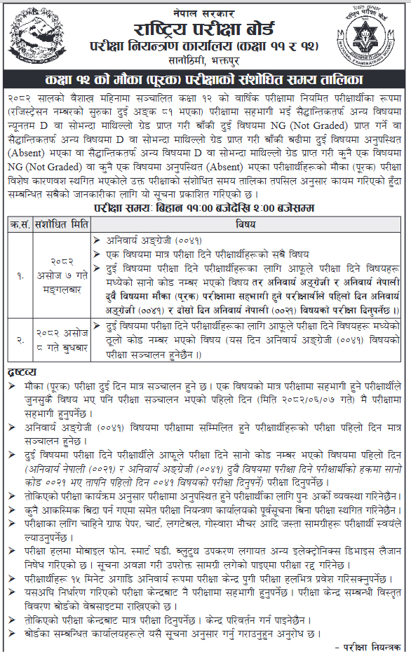 राष्ट्रिय परीक्षा बोर्डको परीक्षा नियन्त्रण कार्यालय कक्षा ११ र १२ ले संशोधित नयाँ तालिका सार्वजनिक गरेको छ । नयाँ तालिका अनुसार मौका परीक्षा यही असोज ७ गते र ८ गतेका लागि तोकिएको छ ।