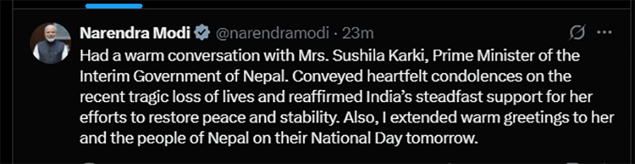 त्यसक्रममा मोदीले नेपालमा शान्ति र स्थायित्व कायम गर्न कार्की नेतृत्वको सरकारलाई भारतले निरन्तर सहयोग गर्ने प्रतिबद्धता जनाएका छन् । यो जानकारी मोदी आफैंले एक्समार्फत् दिएका हुन् ।