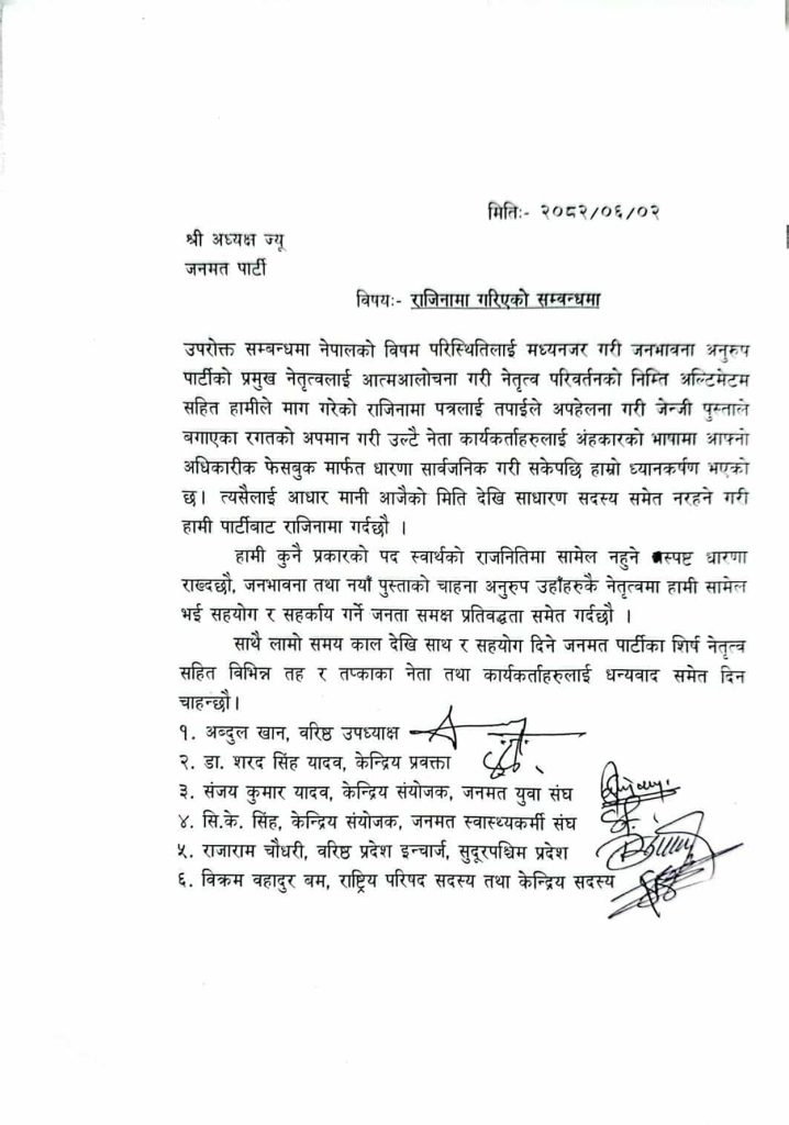 डा. सीके राउत नेतृत्वको जनमत पार्टीका केन्द्रीय तहका ६ नेताले पार्टी परित्याग गरेका छन् ।