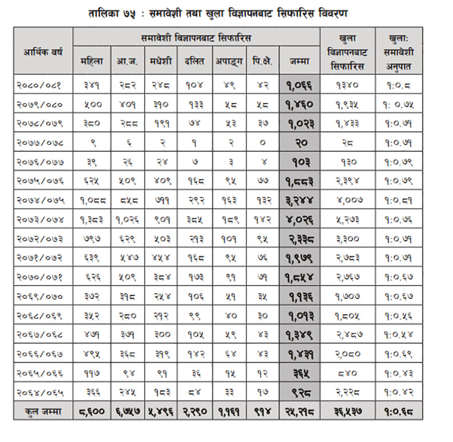 आर्थिक वर्ष २०८०/०८१ मा मात्रै समावेशी विज्ञापनबाट कुल १ हजार ६६ जना उम्मेदवार स्थायी नियुक्तिका लागि सिफारिस भएका छन्। जसमा महिलातर्फ ३४१, आदिवासीरजनजातितर्फ २८२, मधेशीतर्फ २४८, दलिततर्फ १०४, अपाङ्गतर्फ ४९ र पिछडिएको क्षेत्रतर्फ ४२ उम्मेदवार सिफारिस भएका छन्।
