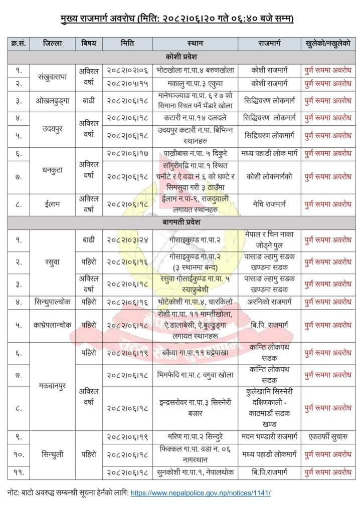 देशभर यी १९ ठाउँमा सडक अवरुद्ध (विवरणसहित)