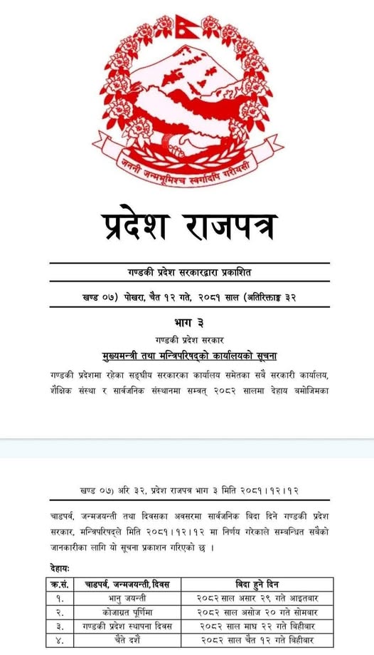 गण्डकीमा आज सार्वजनिक बिदा दिइएको छ । प्रदेश सरकारले हरेक वर्ष कोजाग्रत पूर्णिमाको दिन बिदा दिँदै आएको छ।
