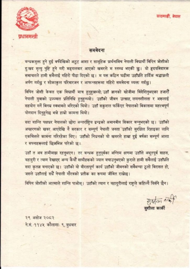 ‘विपिन जोशी केवल एक विद्यार्थी मात्र हुनुहुन्नथ्योस उहाँ ज्ञानको खोजीमा विदेशिनुभएका हजारौं नेपाली युवाको उज्ज्वल प्रतिनिधि हुनुहुन्थ्यो । उहाँको जीवन उत्साह, लगनशीलता र अरूलाई सहयोग गर्ने विनम्र स्वभावले भरिएको थियो,’ प्रधानमन्त्री कार्कीले भनेकी छिन् ।
