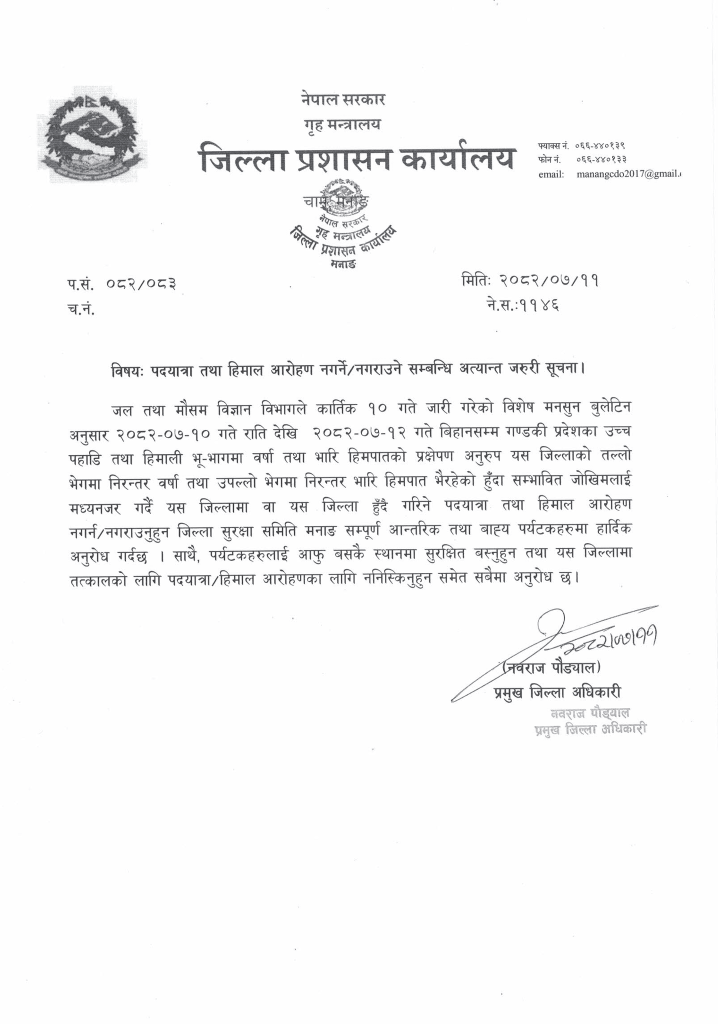 जिल्ला प्रशासन कार्यालय मनाङका प्रमुख जिल्ला अधिकारी नवराज पौड्यालले मंगलबार एक सूचना जारी गर्दै जिल्लामा तथा सो हुँदै गरिने पदयात्रा र हिमाल आरोहण कार्य तत्कालका लागि स्थगित गर्न आग्रह गरेका हुन्।