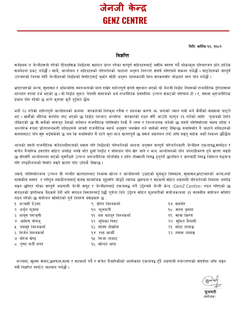 आहुतिको नेतृत्वमा रहेको वैज्ञानिक समाजवादी कम्युनिस्ट पार्टीकी नेतृ फूलमतीको संयोजकत्वमा ‘जेनजी केन्द्र’ गठन भएको छ । एक विज्ञप्ति जारी गर्दै केन्द्रले २२ सदस्यीय संयोजन समितिको समेत घोषणा गरेको छ, जसले देशव्यापी रूपमा सङ्गठन विस्तार गर्ने लक्ष्य लिएको जनाएको हो ।