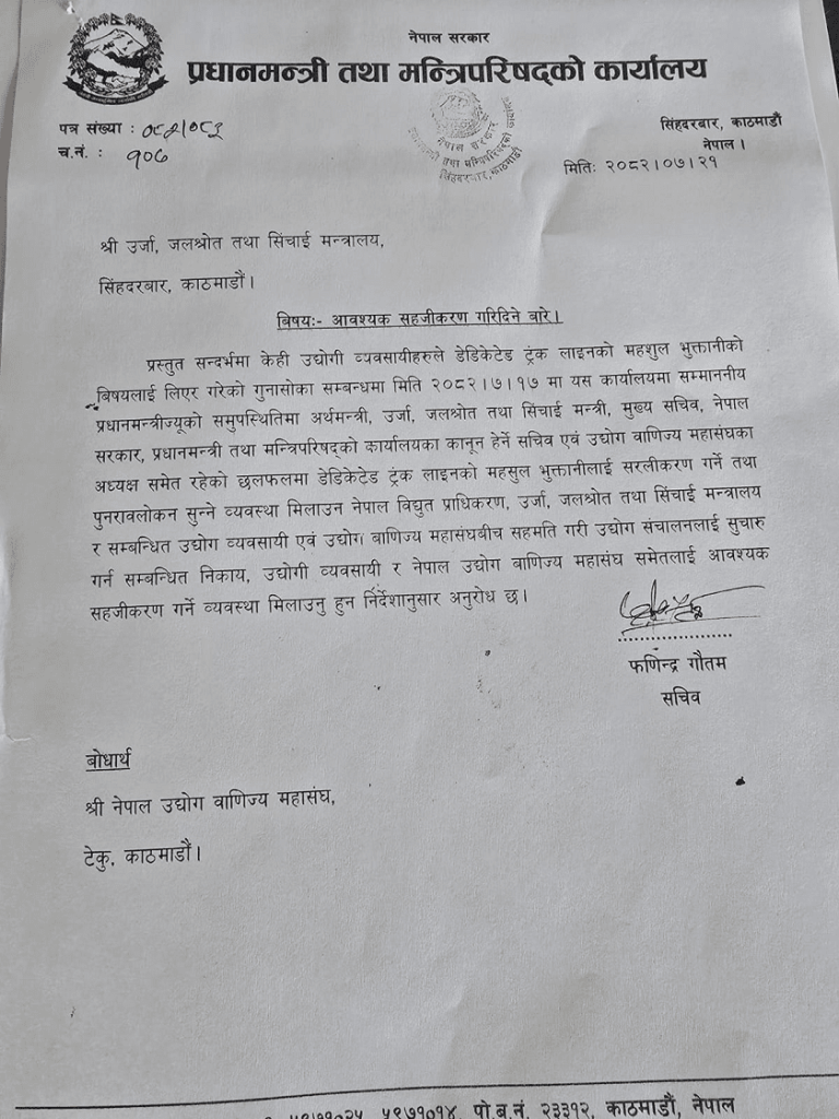 प्रधानमन्त्री तथा मन्त्रिपरिषद्को कार्यालयले ऊर्जा मन्त्रालय र नेपाल विद्युत् प्राधिकरणलाई डेडिकेटेड ट्रंक लाइनको महसुल भुक्तानीका सम्बन्धमा सहजीकरणका लागि निर्देशन दिएको छ ।