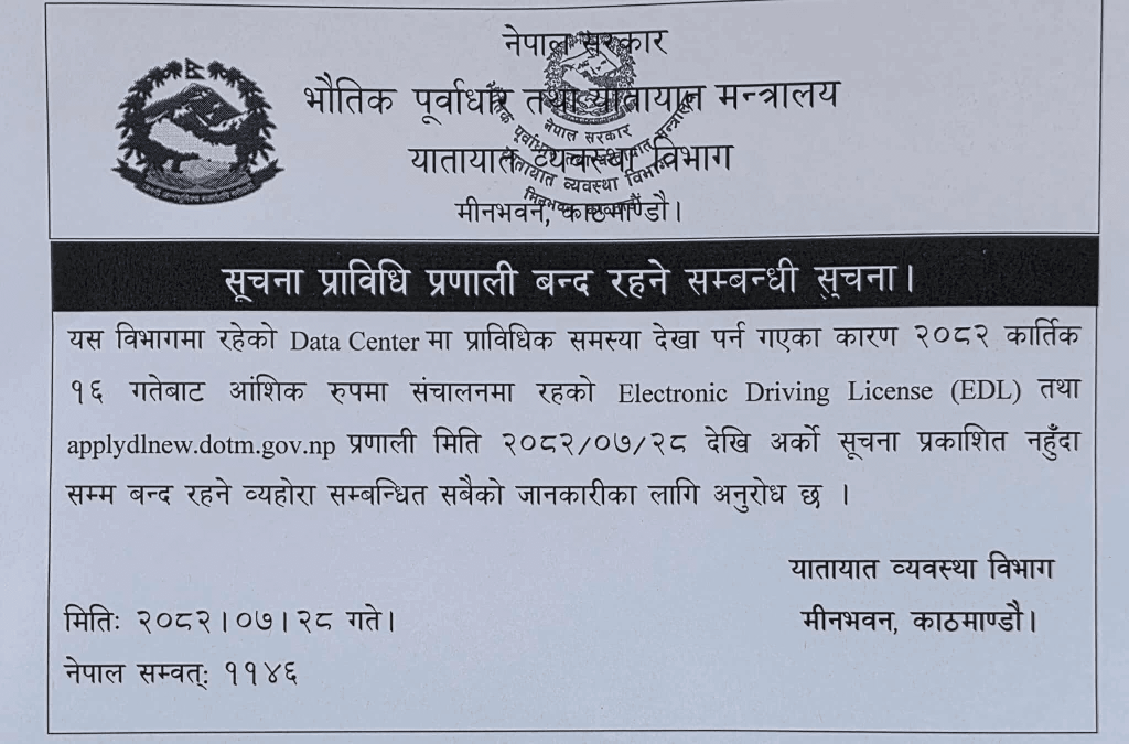 विभागको मीनभवनस्थित डेटा सेन्टरमा उत्पन्न प्राविधिक समस्याका कारण इलेक्ट्रोनिक्स ड्राइभिङ लाइसेन्स प्रणाली तथा  applydlnew.dotm.gov.np  मार्फत प्रदान गरिने सेवा आजदेखि पूर्ण रूपमा बन्द गरिएको विभागले सूचनामार्फत जानकारी दिएको छ।