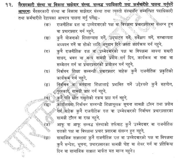 निर्वाचन आयोगले तयार पारेको निर्वाचन आचारसंहितामा यस्तो व्यवस्था छ । प्रतिनिधि सभाको चुनाव अगामी फागुन २१ गते हुँदैछ । उक्त चुनावका लागि तयार आचारसंहितामा गैरसरकारी संस्था वा विकास साझेदार संस्था, सम्बद्ध पदाधिकारी तथा कर्मचारीले पालना गर्नुपर्ने आचरणसम्बन्धी व्यवस्था आचारसंहिताको बुँदा नम्बर १२ मा छ ।