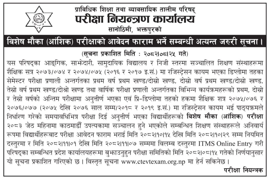 प्राविधिक शिक्षा तथा व्यावसायिक तालिम परिषद् (सीटीईभीटी)परीक्षा नियन्त्रण कार्यालय सानोठिमी, भक्तपुरले विशेष मौका (आंशिक)परीक्षाको लागि आवेदन फाराम भर्नका लागि अत्यन्त जरुरी सूचना प्रकाशित गरेको छ।