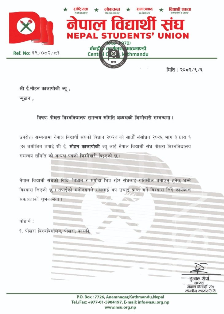 ‘नेपाल विद्यार्थी संघको विधान २०२७ को सातौँ संशोधन २०७५ भाग ३ धारा ६ (७) बमोजिम तपाई ई।मोहन कालाथोकीज्यूलाई नेपाल विद्यार्थी सङ्घ पोखरा विश्वविद्यालय समन्वय समिति को अध्यक्ष पदको जिम्मेवारी दिइएको छ,’ शेर्पाले मनोनयन पत्रमा लेखेका छन् ।