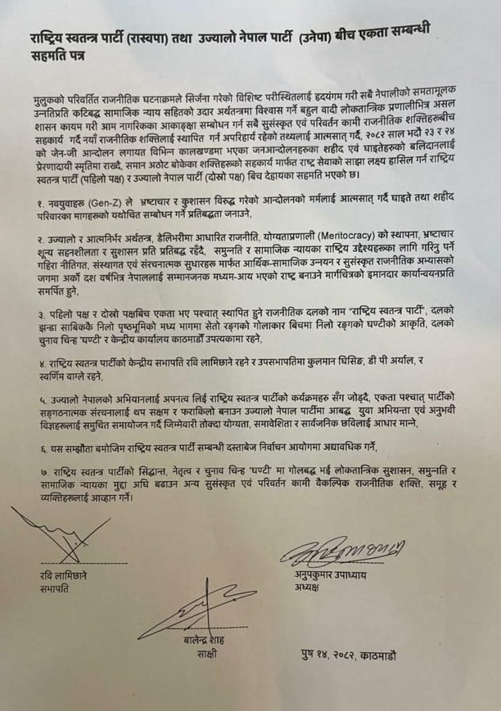 मुलुकको परिवर्तित राजनीतिक घटनाक्रमले सिर्जना गरेको विशिष्ट परीस्थितलाई हृदयंगम गरी सबै नेपालीको समतामूलक उन्नतिप्रति कटिबद्ध सामाजिक न्याय सहितको उदार अर्थतन्त्रमा विश्वास गर्ने बहुल वादी लोकतान्त्रिक प्रणालीभित्र असल शासन कायम गरी आम नागरिकका आकाङ्क्षा सम्बोधन गर्न सबै सुसंस्कृत एवं परिवर्तन कामी राजनीतिक शक्तिहरूबीच सहकार्य गर्दै नयाँ राजनीतिक शक्तिलाई स्थापित गर्न अपरिहार्य रहेको तथ्यलाई आत्मसात् गर्दै, २०८२ साल भदौ २३ र २४ को जेन-जी आन्दोलन लगायत विभिन्न कालखण्डमा भएका जनआन्दोलनहरुका शहीद एवं घाइतेहरुको बलिदानलाई प्रेरणादायी स्मृतिमा राख्दै, समान अठोट बोकेका शक्तिहरूको सहकार्य मार्फत राष्ट्र सेवाको साझा लक्ष्य हासिल गर्न राष्ट्रिय स्वतन्त्र पार्टी (पहिलो पक्ष) र उज्यालो नेपाल पार्टी (दोस्रो पक्ष बिच देहायका सहमति भएको छ।