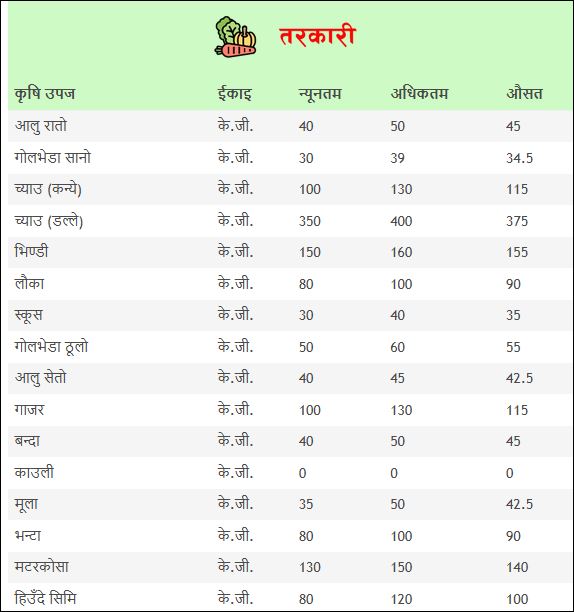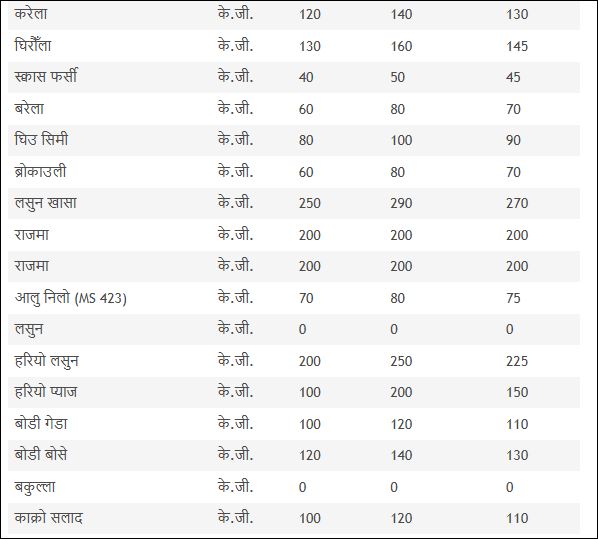 आज प्याज प्रति के.जी ७० देखि ८० रुपैयाँसम्म मण्डीबाट किनबेच भएको छ । गाजर १०० देखि १३० रुपैयाँ सम्म केजी रहेको छ । रायोको साग ३० देखि ४० रुपैयाँ छ ।बन्दा ४० देखि ५० रुपैयाँ के.जी छ ।