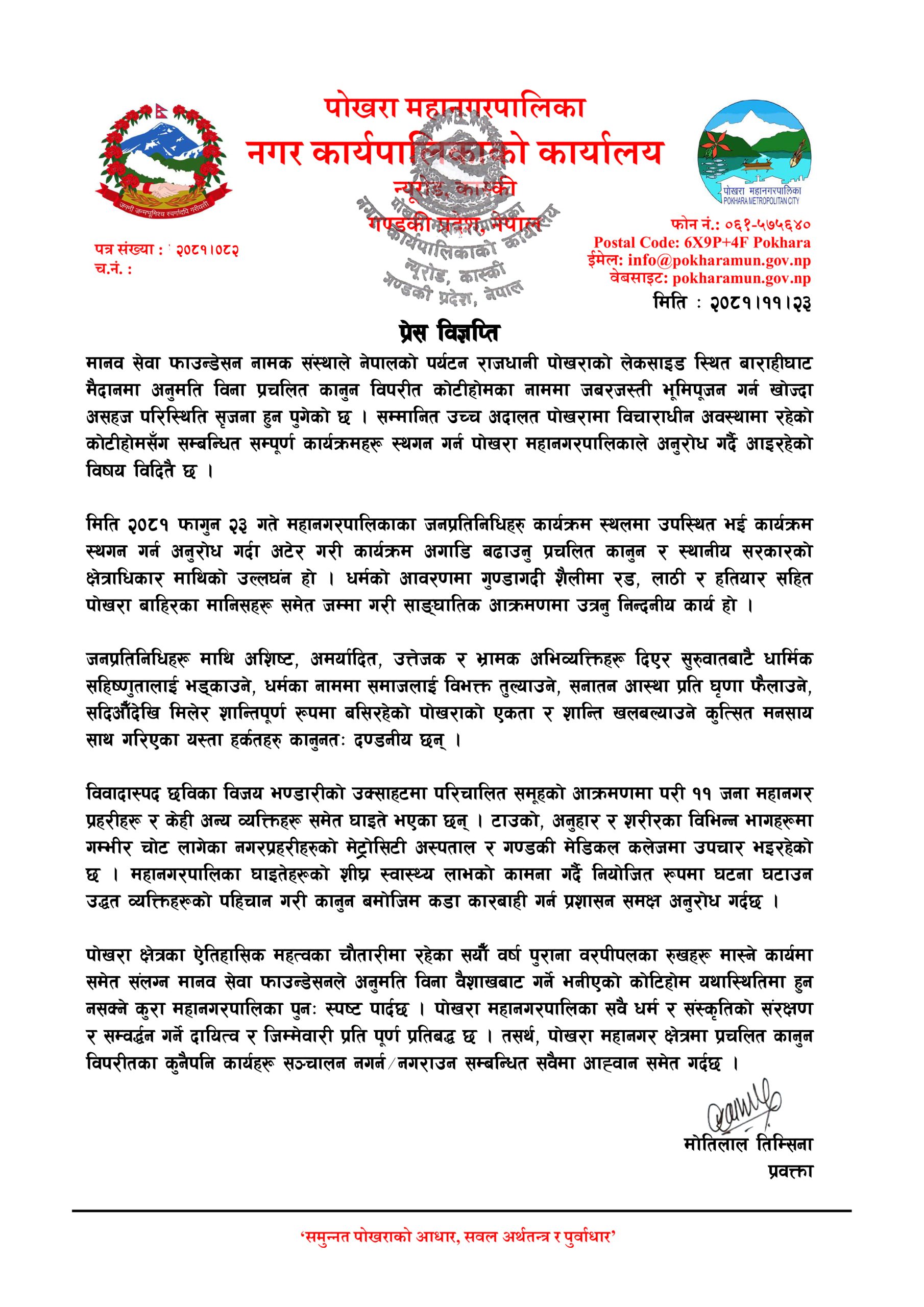 विज्ञप्तीमा मानव सेवा फाउन्डेसन नामक संस्थाले नेपालको पर्यटन राजधानी पोखराको लेकसाइड स्थित बाराहीघाट मैदानमा अनुमति विना प्रचलित कानुन विपरीत कोटीहोमका नाममा जबरजस्ती भूमिपूजन गर्न खोज्दा असहज परिस्थिति सृजना हुन पुगेको जनाइएको छ ।