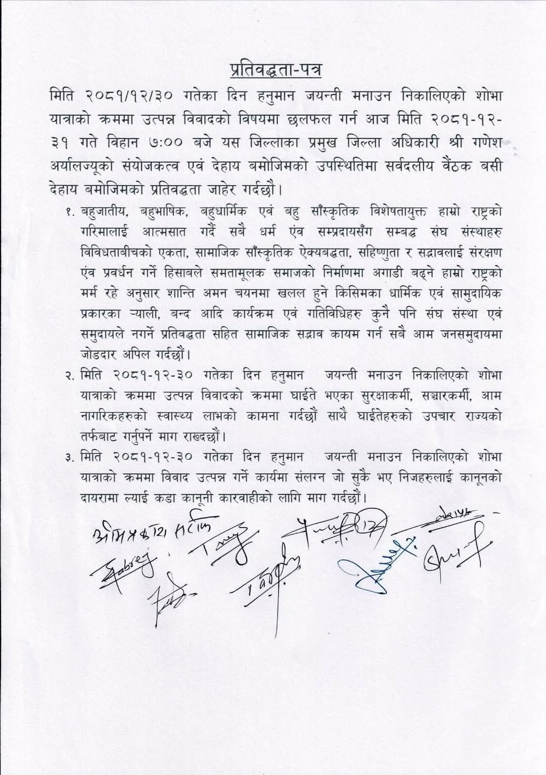जिल्ला प्रशासन कार्यालय पर्सामा बसेको सो बैठकमा दलका प्रतिनिधिहरूले सबै धर्म एवम् सम्प्रदाय सम्बद्ध सङ्घ संस्थाहरू विविधताबिचको एकता, सामाजिक सांस्कृतिक ऐक्यबद्धता, सहिष्णुता र सदभावलाई संरक्षण एवम् प्रवद्र्धन गर्ने हिसाबले समतामूलक समाजको निर्माणमा अगाडि बढ्ने राष्ट्रको मर्म रहेअनुसार शान्ति, अमनचयनमा खलल हुने किसिमका धार्मिक एवम् सामुदायिक प्रकारका ¥याली, बन्द आदि कार्यक्रम एवम् गतिविधिहरू कुनै पनि सङ्घ संस्था एवम् समुदायले नगर्ने प्रतिबद्धतासहित सद्भाव कायम गर्न सबैमा अपिल गरेका छन् ।