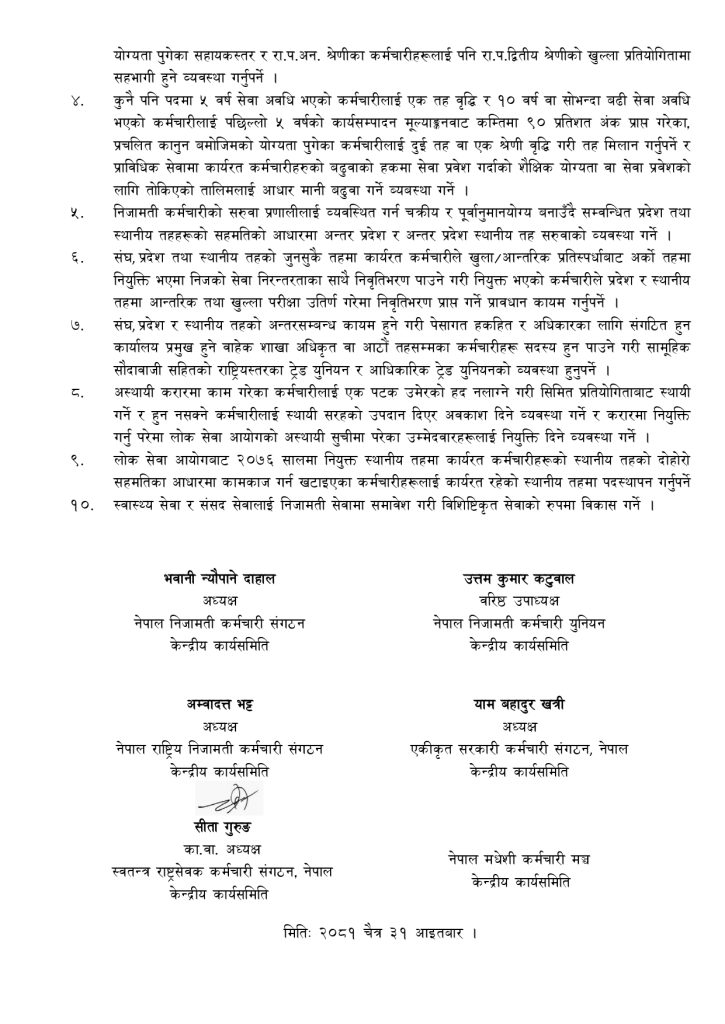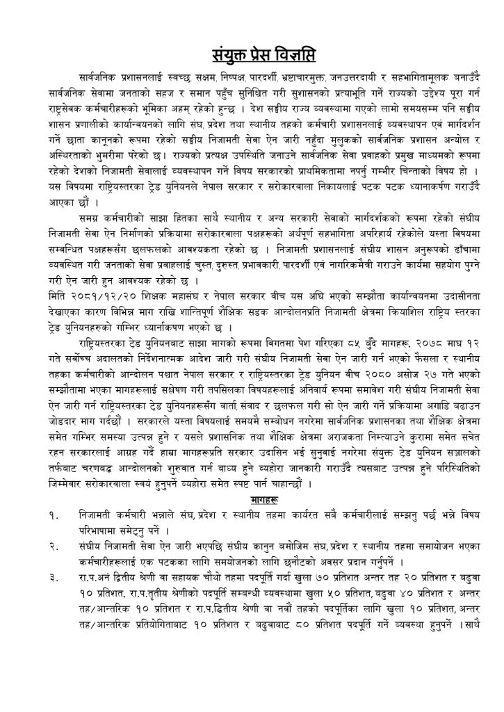नेपाल निजामती कर्मचारी संगठन, कर्मचारी युनियन, राष्ट्रिय निजामती कर्मचारी संगठन, एकीकृत सरकारी कर्मचारी संगठन, स्वतन्त्र राष्ट्रसेवक कर्मचारी संगठन र मधेशी कर्मचारी मञ्चले संयुक्त विज्ञप्ति जारी गर्दै उक्त जानकारी गराएका हुन् ।