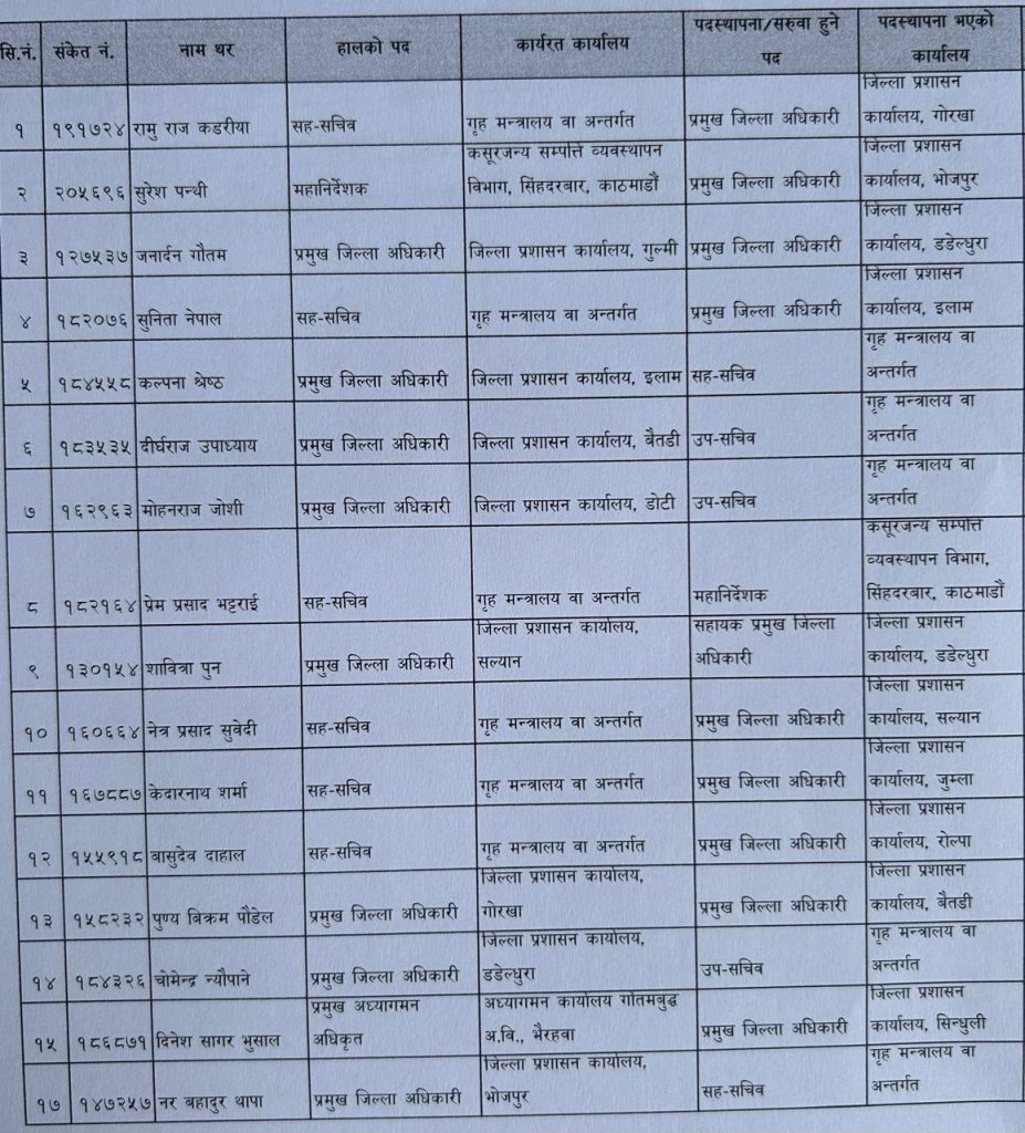 सरुवा गरिएका प्रमुख जिल्ला अधिकारीमा १५ सहसचिव र ५ उपसचिव छन् । गृहले गोरखामा सहसचिव रामुराज कडरियालाई पठाइएको छ ।