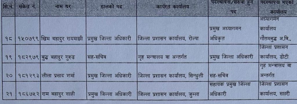 २० प्रमुख जिल्ला अधिकारीको सरुवा (सूचीसहित)