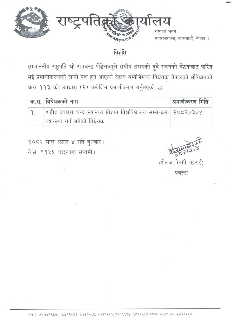 राष्ट्रपति रामचन्द्र पौडेलले शहीद दशरथ चन्द स्वास्थ्य विज्ञान विश्वविद्यालयको सम्बन्धमा व्यवस्था गर्न बनेको विधेयक प्रमाणीकरण गरेका छन् ।