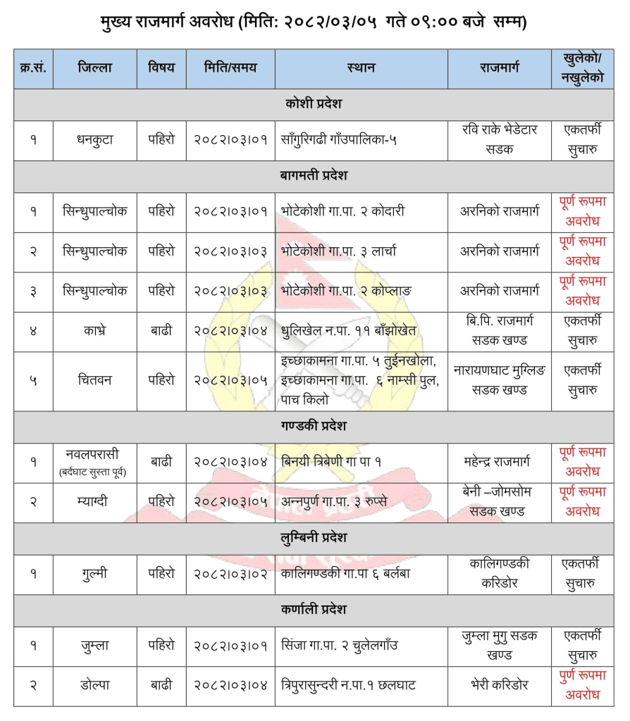 नेपाल प्रहरीले बिहीबार बिहान ९ः१६ बजे फेसबुकमार्फत दिएको जानकारीअनुसार धनकुटा, सिन्धुपाल्चोक, काभ्रे, चितवन, नवलपरासी, ग्याग्दी, गुल्मी, जुम्ला र डोटी जिल्लामा पर्ने ती मुख्य राजमार्गका सडक अवरुद्ध बनेका हुन् ।