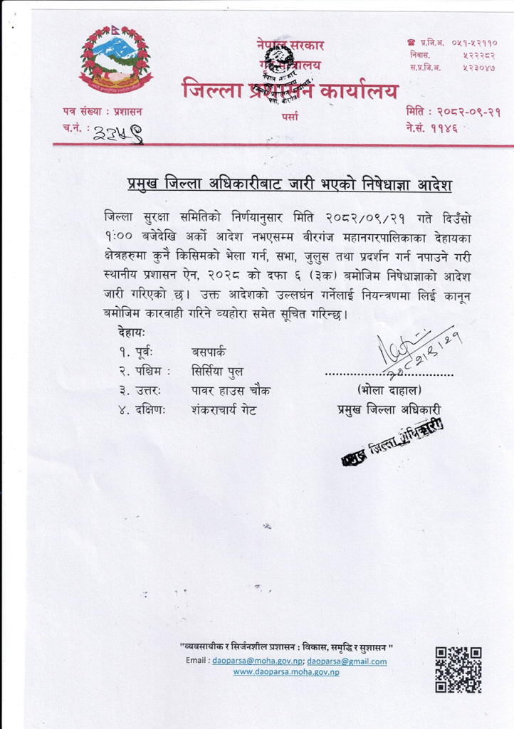 वीरगञ्ज महानगरपालिका क्षेत्र अन्तर्गत पूर्वमा बसपार्क, पश्चिममा सिर्सिया पुल, उत्तरमा पावर हाउस चोक र दक्षिणमा शंकराचार्य गेटसम्म कुनै किसिमको भेला गर्न, सभा, जुलुस तथा प्रदर्शन गर्न नपाउने गरी निषेधाज्ञा जारी गरिएको पर्साका प्रमुख जिल्ला अधिकारी भोला दाहालले जारी गरेको सूचनामा उल्लेख छ ।