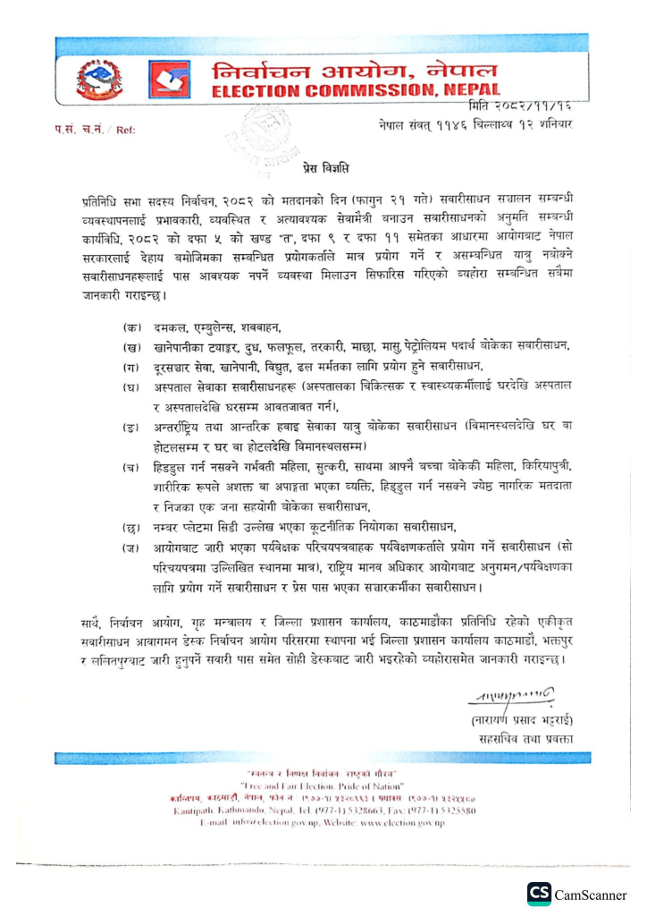 आयोगले एक प्रेस विज्ञप्ति जारी गर्दै निर्वाचनको दिन सवारी आवागमनलाई व्यवस्थित र सेवामैत्री बनाउन यस्तो निर्णय गरेको जनाएको हो। आयोगका सहसचिव तथा प्रवक्ता नारायण प्रसाद भट्टराईद्वारा जारी विज्ञप्ति अनुसार, अत्यावश्यक सेवाका सवारी साधनहरूले मतदानको दिन सवारी अनुमति पत्र (पास) लिनु पर्दैन ।