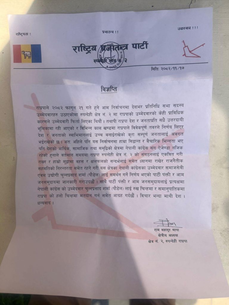 प्राविधिक कारण देखाउँदै उम्मेदवारी फिर्ता लिएको राप्रपाले आइतबार विज्ञप्ति जारी गर्दै कांग्रेसलाई समर्थन गर्ने जानकारी दिएको हो । रुपन्देही क्षेत्र नम्बर २ मा कांग्रेसबाट चुन्नप्रसाद शर्मा९पौडेल० प्रतिनिधि सभा सदस्यका उम्मेदवार छन्।