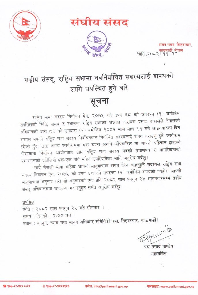 राष्ट्रियसभा सदस्यमा निर्वाचित भएका १८ जनाको फागुन २५ गते पद तथा गोपनियताको शपथ हुने भएको छ ।गत माघ ११ गते भएको निर्वाचनबाट निर्वाचित भएकाहरुको सपथ फागुन २५ गते् दिउँसो २ बजे सिंहदरबारस्थित कानुन न्याय तथा मानवअधिकार समितिको हलमा हुने संघीय संसद् सचिवालयका प्रवक्ता सहसचिव एकराम गिरीले जानकारी दिए ।
